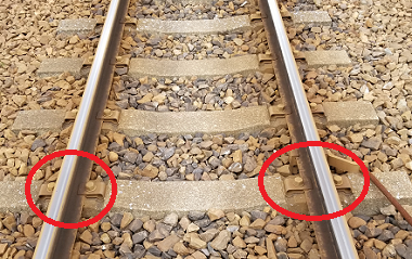 ようするに、クギによるレールとマクラギの締結が不十分だと、レールがグラついて軌間が拡大してしまう。軌間拡大にはいろんなパターンがありますが、これが一例です。